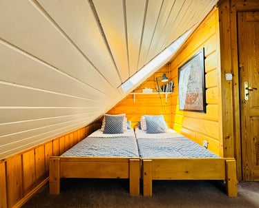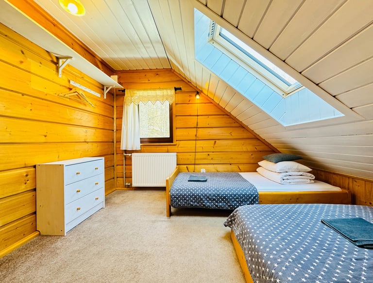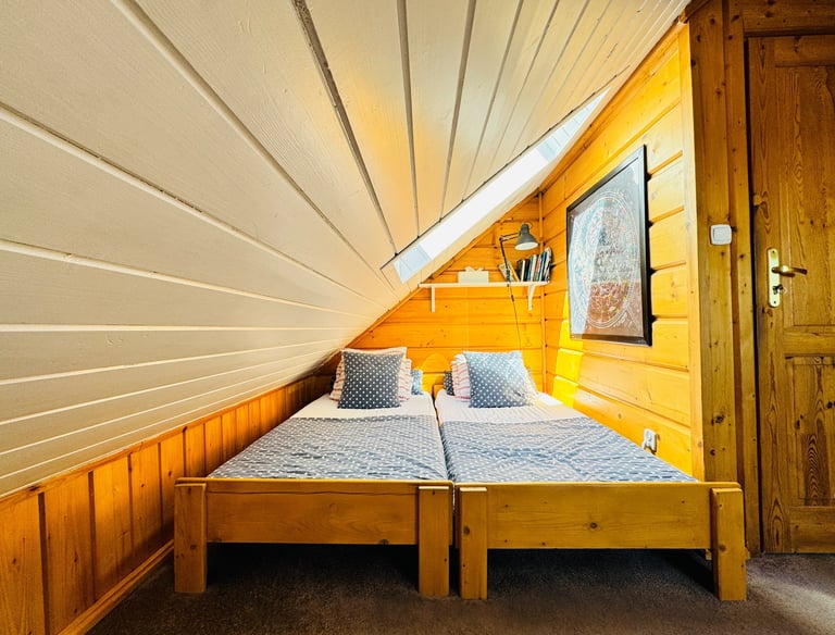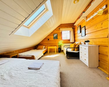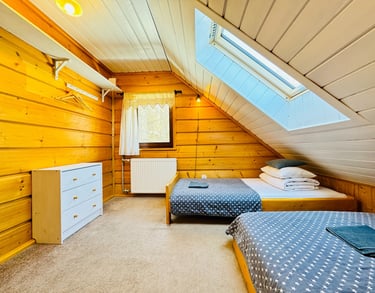 Przytulny pokój dla dwóch, trzech, a nwet czterech osób. Dwa osobne łóżka i rozkładana sofa. A nad głową nocna mapa nieba. Taka prawdziwa, z gwiazdozbiorami, które świecą jak zgasisz lampkę. Zasypiasz patrząc w gwiazdy, a rano budzisz się z widokiem na góry.