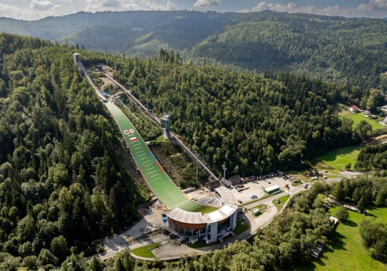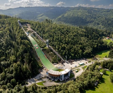 Skocznia im. Adama Małysza — ikona Wisły. Skoro jesteś już tak blisko, warto ją zobaczyć z bliska. Robi wrażenie nawet jeśli nie interesujesz się skokami narciarskimi.