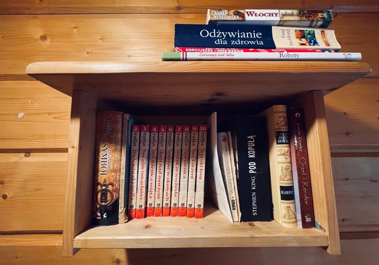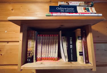 Trzy półki na zewnątrz Chaty i kilka przy aneksie kuchennym. Kryminały, dramaty, książki kulinarne i wszystko pomiędzy. Zasada jest prosta — zostaw swoją książkę, weź inną. Albo po prostu weź i nie zostawiaj nic. Nie pilnujemy.