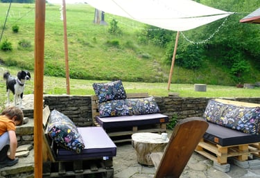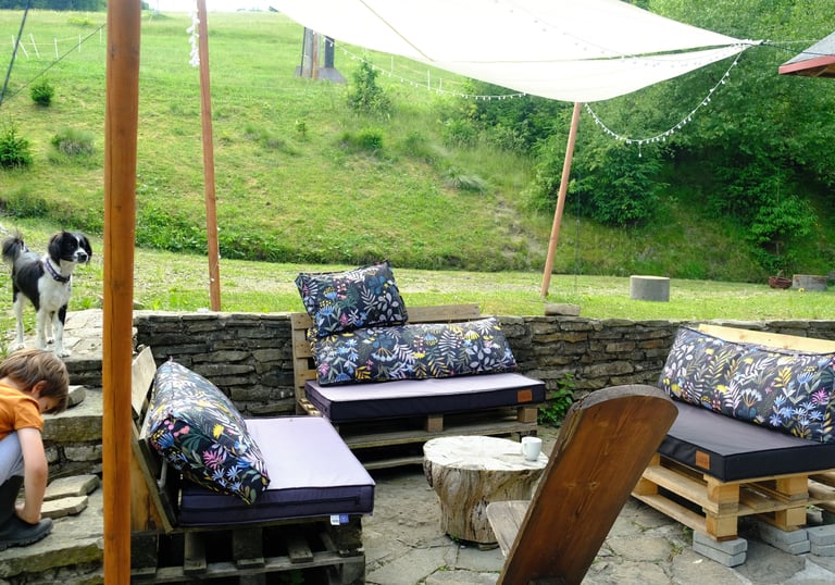Nasz taras jest prosty. Kamienie rzeczne pod nogami, sofy z palet z miękkimi poduchami i stolik z pieńka. Latem osłonięty żaglami przeciwsłonecznymi. Widok na Baranią Górę. Tu nic nie trzeba robić. Wystarczy usiąść i patrzeć.
