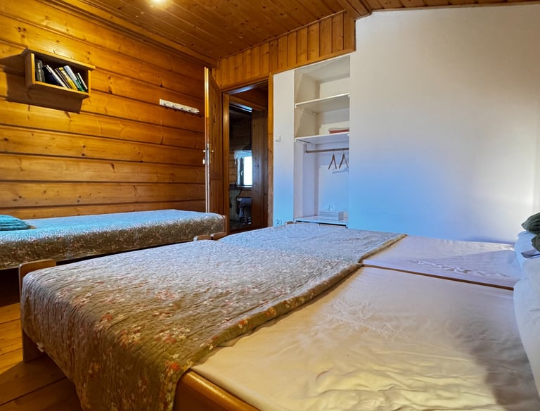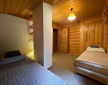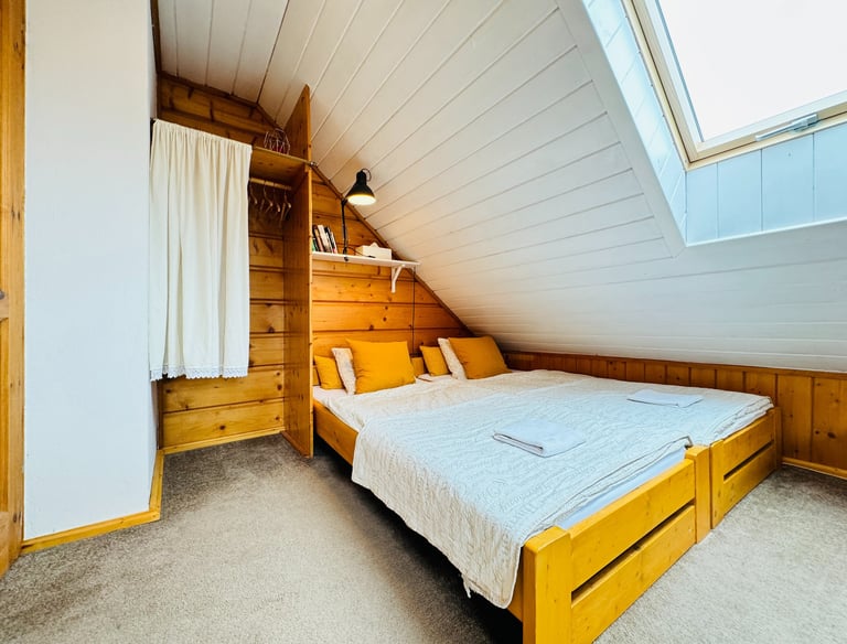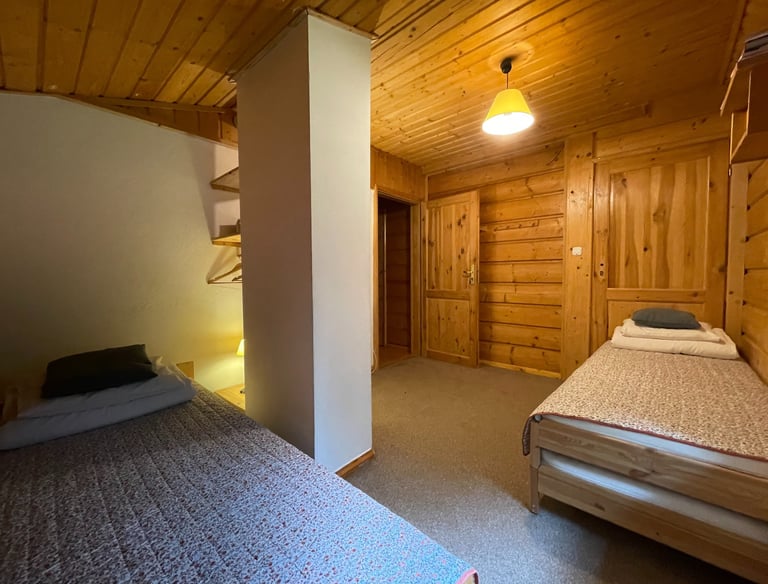 Pokój na parterze z wysokim sufitem i bez skosów. To rzadkość w górskiej chacie i od razu to czuć. Trzy osobne łóżka, widok na las, dużo powietrza i przestrzeni. Jak masz dość przygarbionego chodzenia po poddaszach to tu możesz stanąć prosto i odetchnąć.