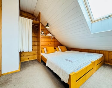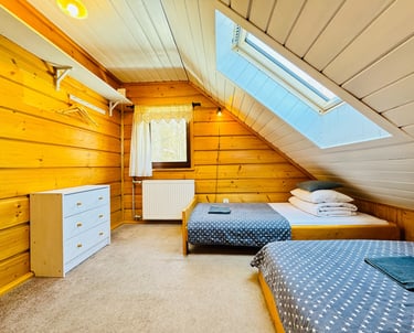 Najmniejszy z pokojów na piętrze, ale ma jeden atut którego inne nie mają: stoi przy kominie. Zimą jest tu najcieplej w całej Chacie. Jedno osobne łóżko i dwuosobowe łózko, widok na las. Idealny dla pary albo rodziny z małym dzieckiem. Jak lubisz zasypiać w cieple i budzić się przy ptakach to ten pokój jest dla Ciebie.