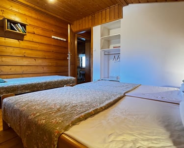 Bliźniak pokoju nr 2. Ten sam układ, ta sama przestrzeń, te same dwa łóżka i sofa do rozłożenia. Tylko zamiast gór masz za oknem ścianę lasu. Latem jest tu zielono za oknem i chłodno. Jesienią kolory których nie da się opisać. Spokój gwarantowany.