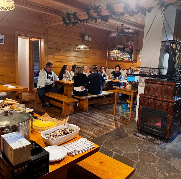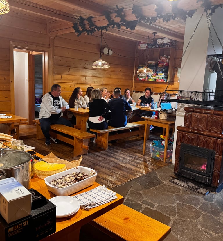 Długie stoły, ławy, kominek który zimą nie gaśnie. Tu zaczyna się dzień: przy śniadaniu, kawie i rozmowie o tym kto idzie na który szlak. I tu kończy się wieczorem dzień: przy planszówkach, herbacie albo po prostu przy ogniu z kominka.