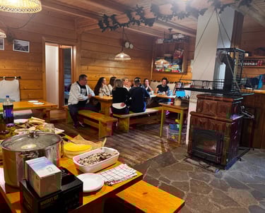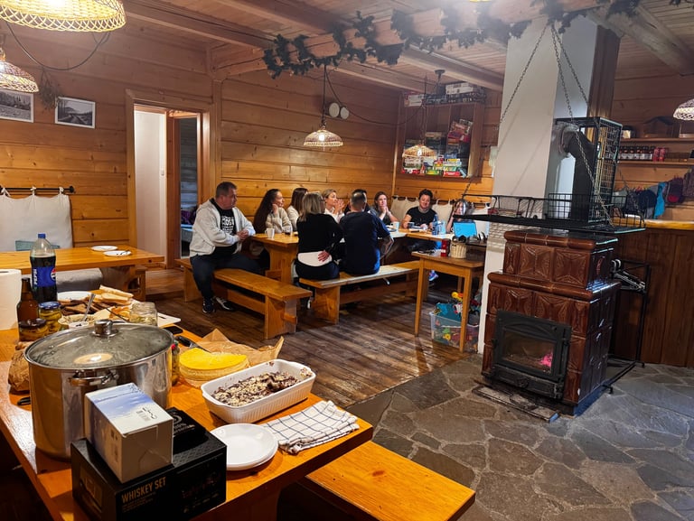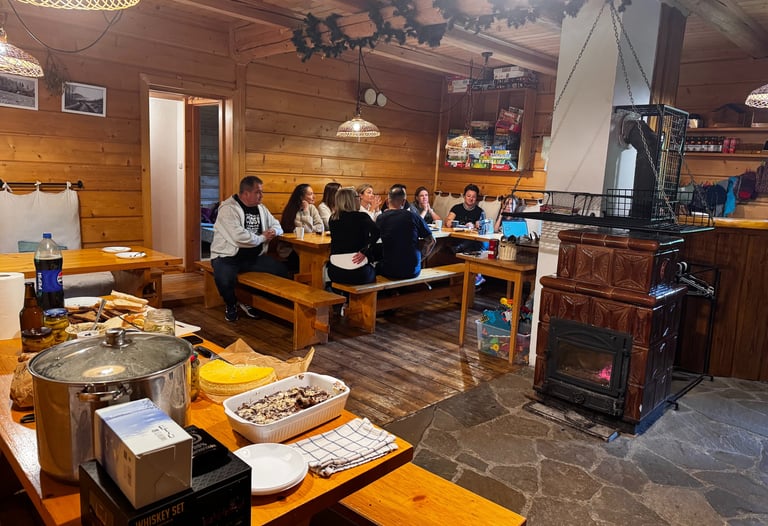 Nasz sylwester ma swoją strukturę i nie jest dla przypadkowych grup. Przyjmujemy zamkniętą ekipę około 15-17 osób na 3 lub 4 doby. W pakiecie są śniadania i obiadokolacje przez cały pobyt. A 31 grudnia wieczorem robi się woeczorowo: ciepłe dania, zimna płyta, przekąski, sałatki, napoje. O północy wychodzimy przed Chatę na ognisko z zimnymi ogniami i szampanem. Zapisy na kolejny sylwester uruchamiamy z dużym wyprzedzeniem.